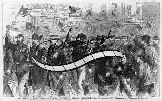 [["Bays of Blue" marching down Chesnut St., Philadelphia. October 2, 1868]]