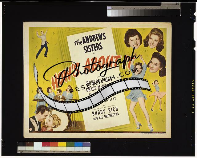 Motion picture poster for "How's About It" showing stars the Andrews Sisters dancing and with drummer Buddy Rich.
