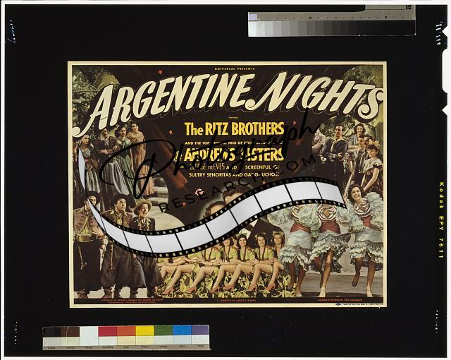 Motion picture poster for "Argentine Nights" showing stars the Ritz Brothers and the Andrews Sisters.