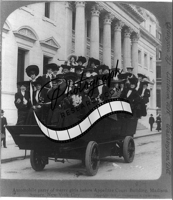 [[Automobile party of merry girls before Appellate Court Building, Madison Square