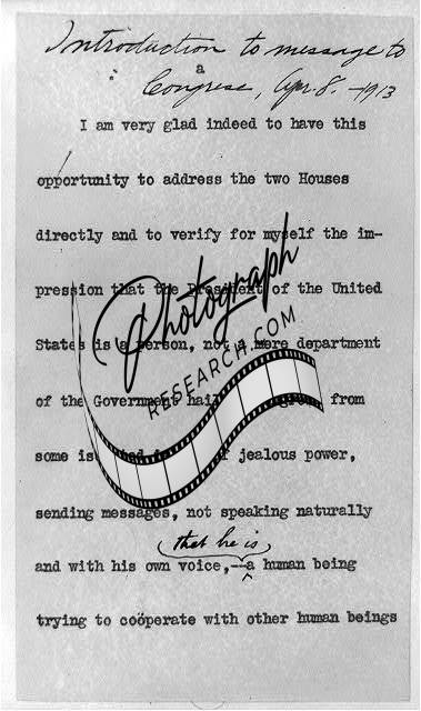 [[First page, Wilson's Introduction to Message to Congress, April 8, 1913]]