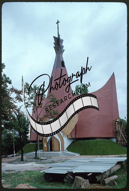 Photograph shows framework of spiral-shaped spire on temple designed by Hellmuth, Obata & Kassabaum.