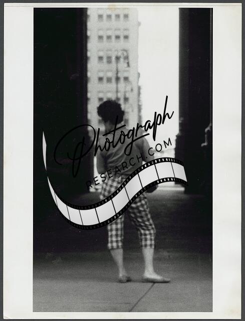 [[View of woman standing in alleway, full-length portrait, from behind]]