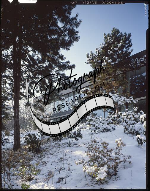 [[Yamasaki Residence, Bloomfield Hills, Michigan. Exterior. View with snow]]