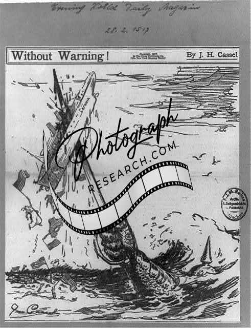 Without warning!,political cartoon,sword,mailed fist of German,ocean,LACONIA