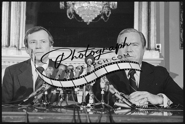 [[Senator Howard Baker and Representative John Rhodes at microphones, possibly du
