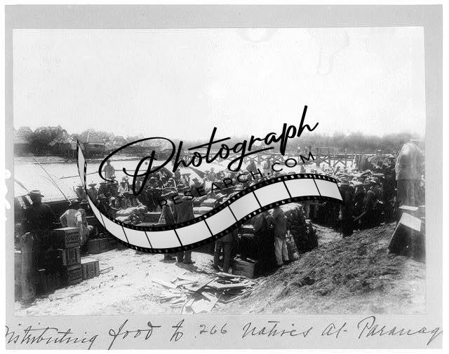 Distributing food to 266 natives at Parnaque,Philippines,c1899,bridge,houses