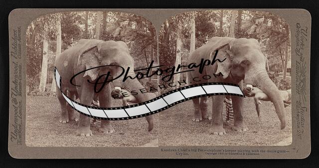 Kandyan chief's big pet--elephant's keeper playing with the docile giant--Ceylon