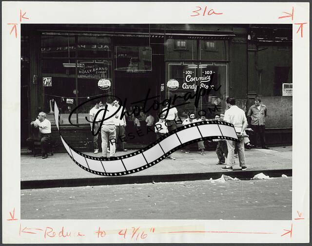 [[Group of men and boys on sidewalk outside of Connie's Candy Store]]