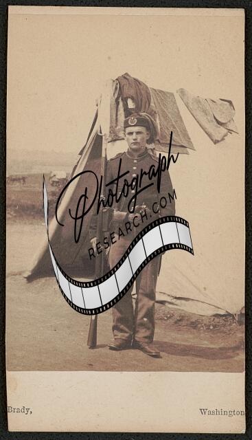 [[Unidentified soldier in Union uniform, New York state belt buckle, and fez with bayoneted rifle, revolver, and Bowie knife in front of tent]] / Brady, Washington.
