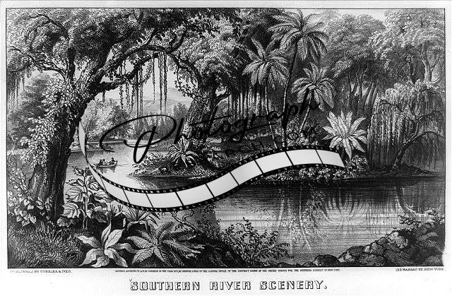Southern river scenery,c1870,Currier & Ives Photo,water,trees,boat,people