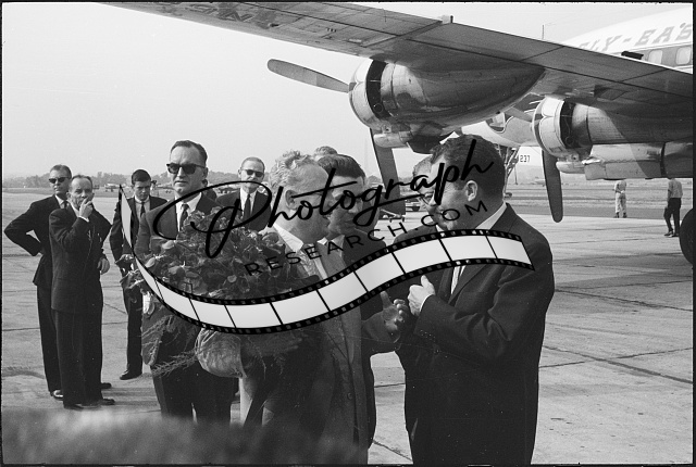 [[Soviet politician Frol Romanovich Kozlov holding bouquet and being greeted by V