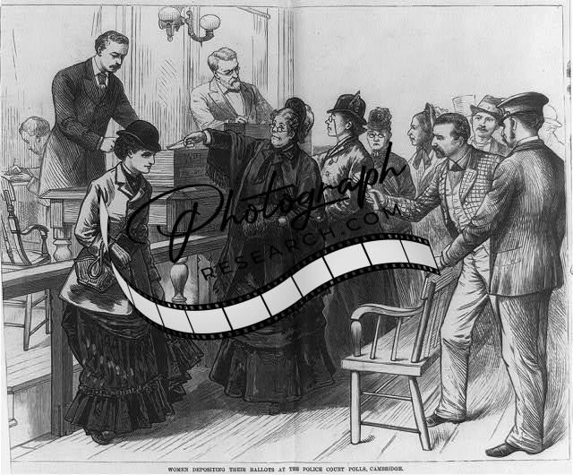 [[Women depositing their ballots at the police court polls, Cambridge]]