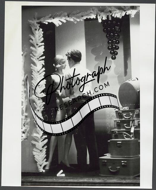[[Store window display - man dressing a mannequin, stack of suitcases displayed o