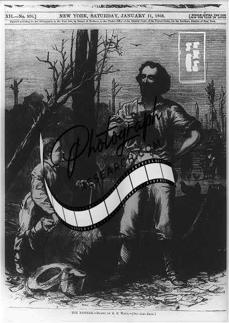 The Pioneer,man holding pitcher,boy seated on log,1868,A.R. Waud,Harper's Weekly