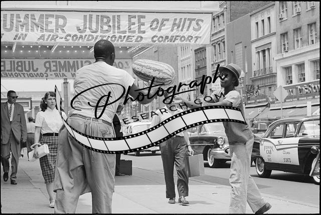 [[Man tossing a watermelon to another man on a street in a city, possibly Washing