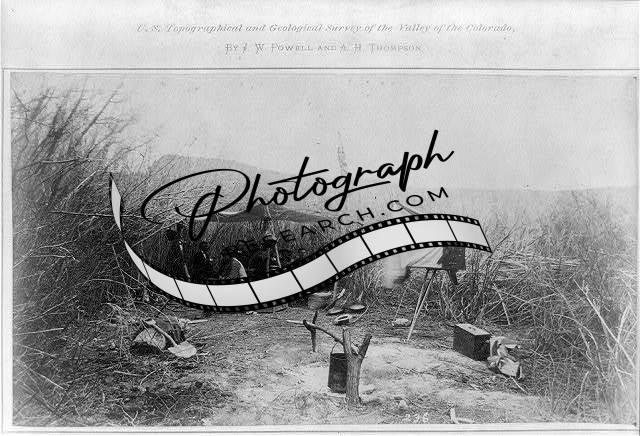[[Powell expedition in camp surrounded by photographic equipment]]