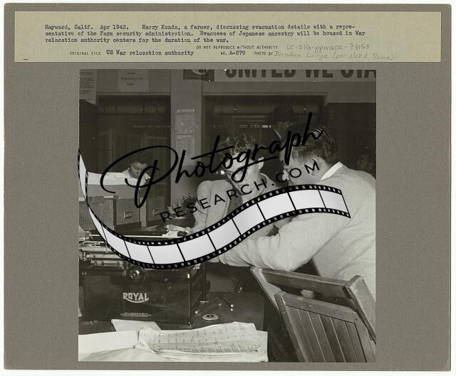 Hayward, Calif. Apr. 1942. Harry Konda, a farmer, discussing evacuation details