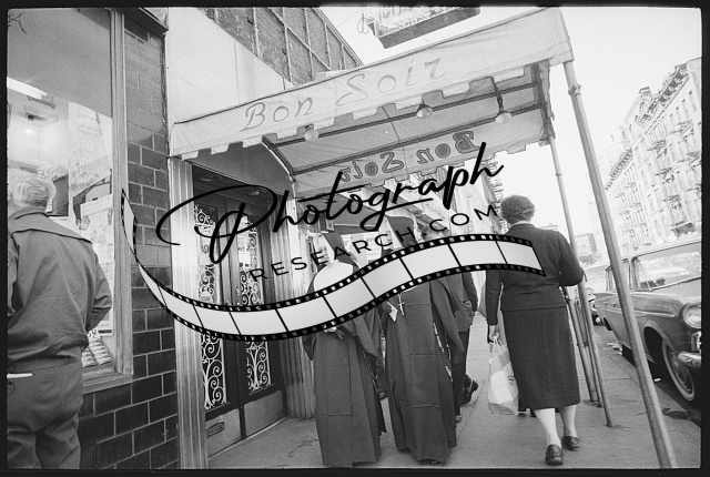 [[Nuns walking under entrance canopy to Bon Soir nightclub]]