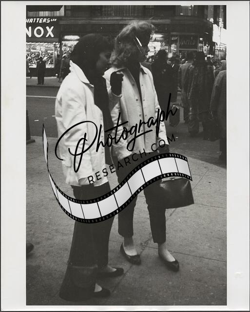 [[Two women, full-length portrait, facing right and standing near corner of sidew