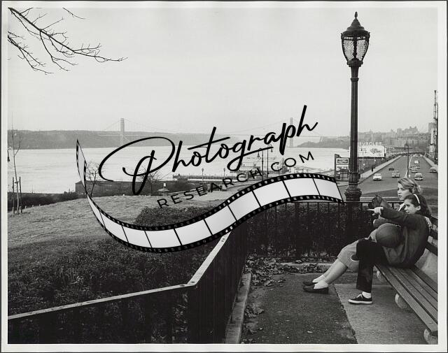 [[Two girls sitting on park bench, one with dog on lap, other pointing and holdin