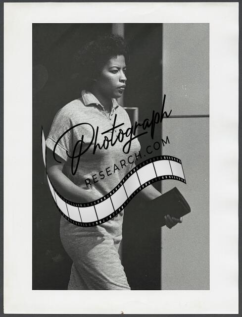 [[Woman, three-quarter length portrait, standing and facing left]]