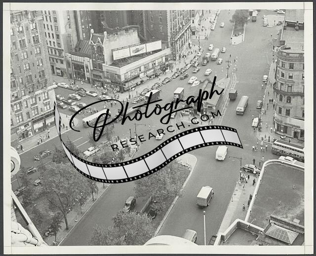 Photograph shows Independence Flagpole, also known as the Charles F. Murphy Memorial Flagpole, in Union Square Park from above. Ohrbach's Coats can be seen in the background.