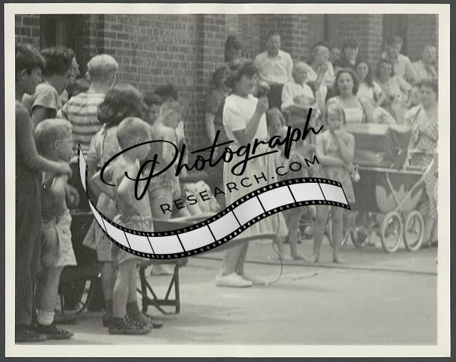 [[Crowd gathered on sidewalk, girl in the middle appears to be holding a micropho