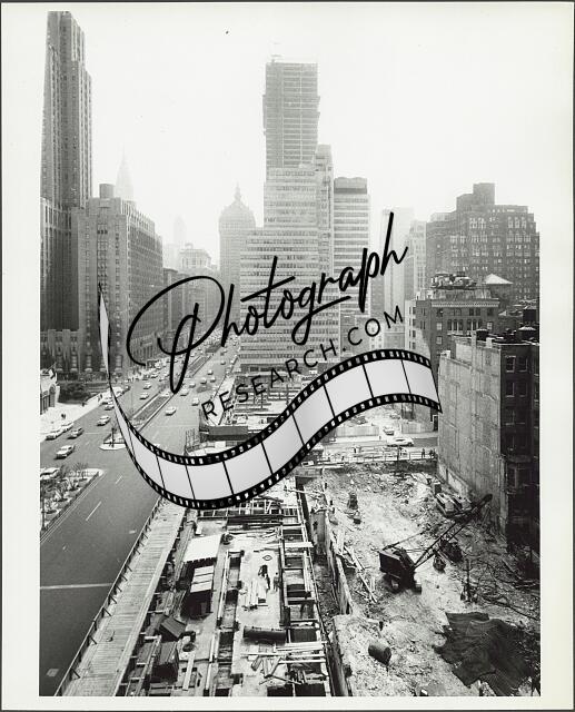 Photograph shows a view of Park Avenue looking toward the Helmsley Building. Building contruction visible on the right side of the street. St. Bartholomew's Church visible on left.