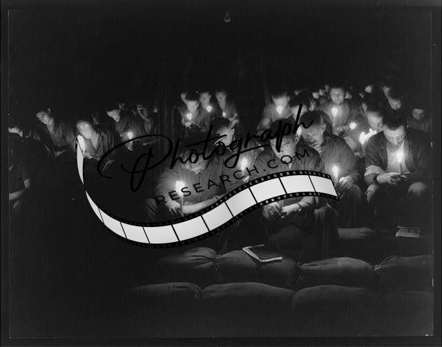 [[Sitting on sand bags in a cancas chapel Navy Seabees pray during holy communion