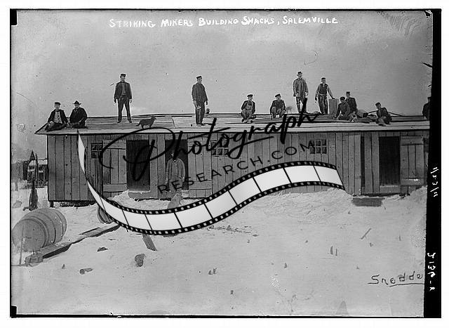 Striking miners building shacks,Salemville,men on roof,snow,barrles,Bain News