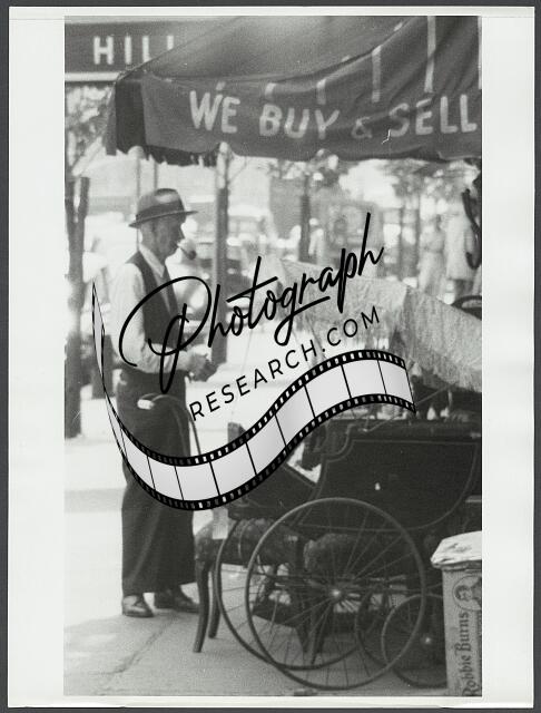 [[Man smoking pipe next to antique furniture stall with text on awning the reads