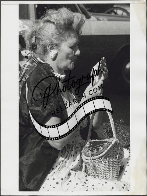 [[Woman with straw handbasket on lap holding up a pocket mirror to her face]]