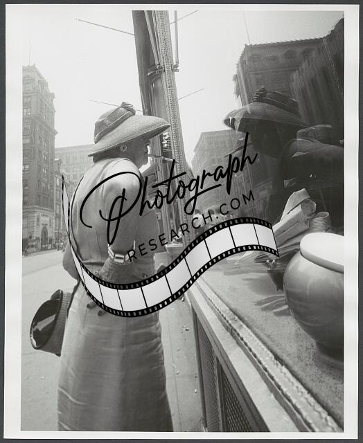 [[Woman, three-quarter length portrait, standing on sidewalk and facing right tow