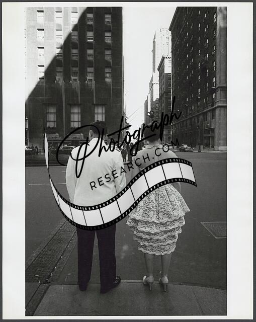 [[Back view of man and woman in formal clothes, standing on edge of sidewalk, wai