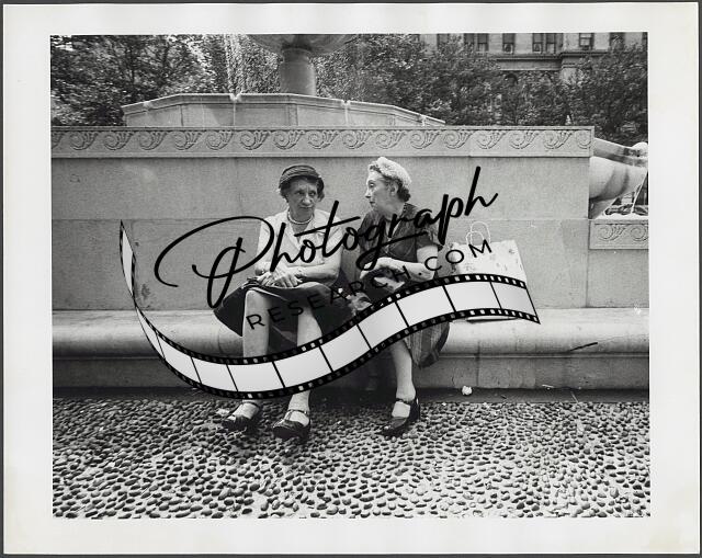 [[Two women, full-length portrait, seated on marble step next to fountain (partia