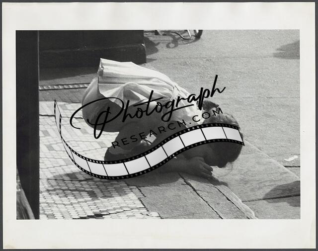 [[Little girl crouched, taking a close look at something on a New York City sidew