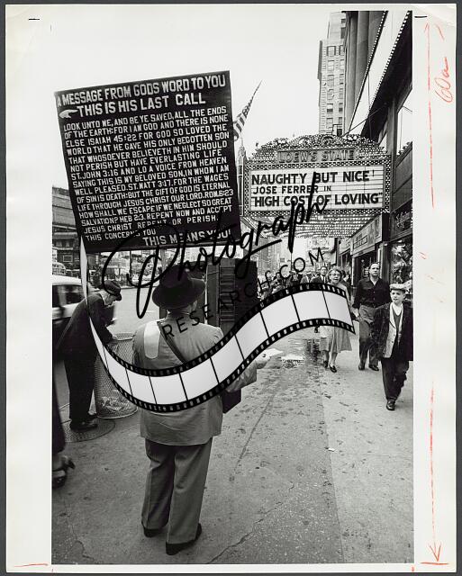 [[Back view of man street preaching on sidewalk while holding a large sign and ha