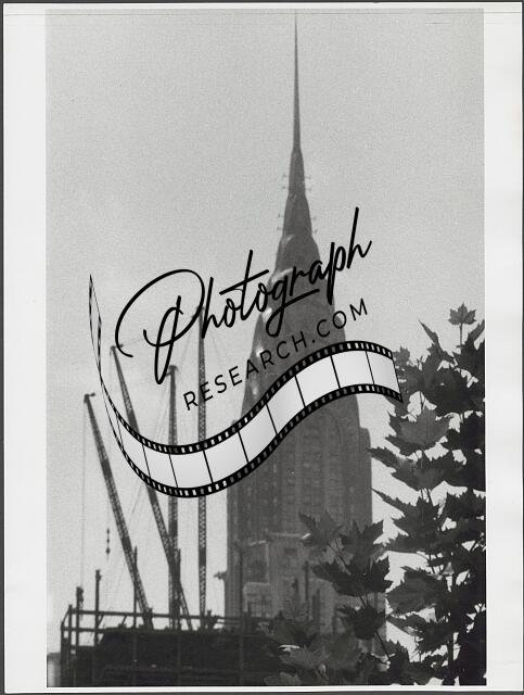 [[View of the Chrysler Building, cranes and tree leaves in foreground]]