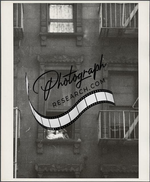 [[Exterior building view, showing woman adjusting young girls hair in open window