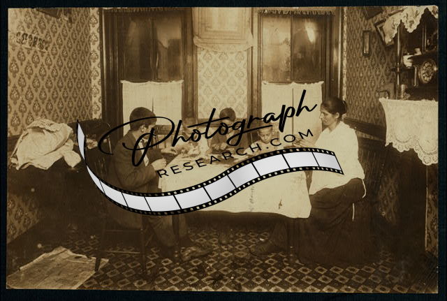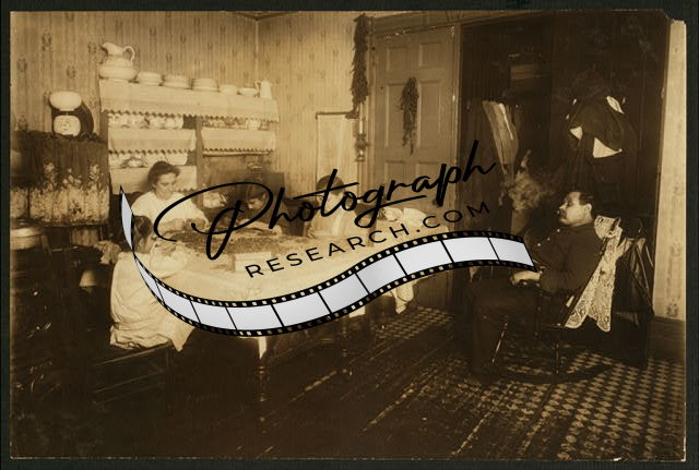 Title: 143 Hudson St., ground floor. Mrs. Salvia; Joe, 10 years old; Josephine, 14 years old; Camille, 7 years old. Picking nuts in a dirty tenement home. The bag of cracked nuts (on chair) had been standing open all day waiting for the children to get home from school. The mangy cat (under table) roamed about over everything. Baby is sleeping in the dark inner bedroom (3 yrs. old). Location: New York, New York (State)