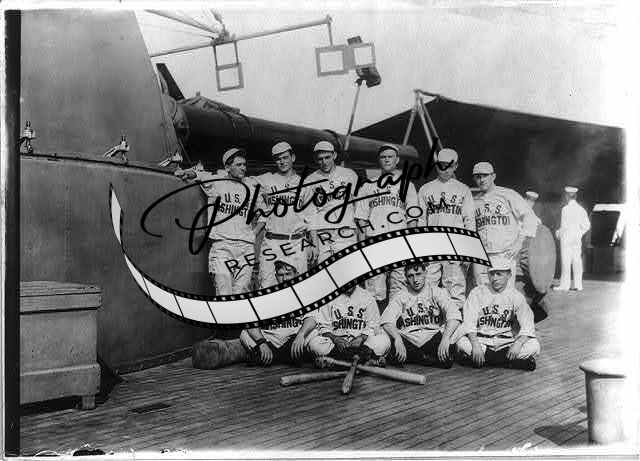 Navy baseball team of USS WASHINGTON on deck,in uniform,3 bats