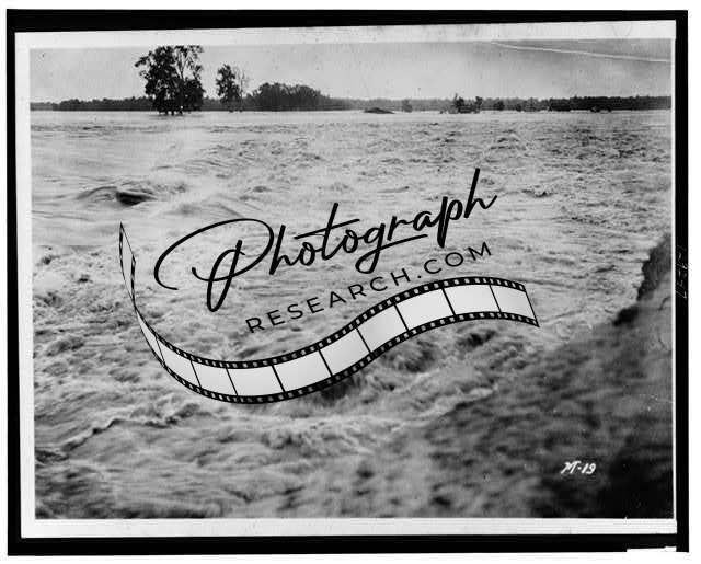 Title: [Torrential floodwaters partially covering one end of a railroad bridge]