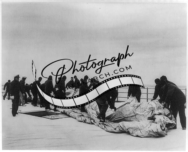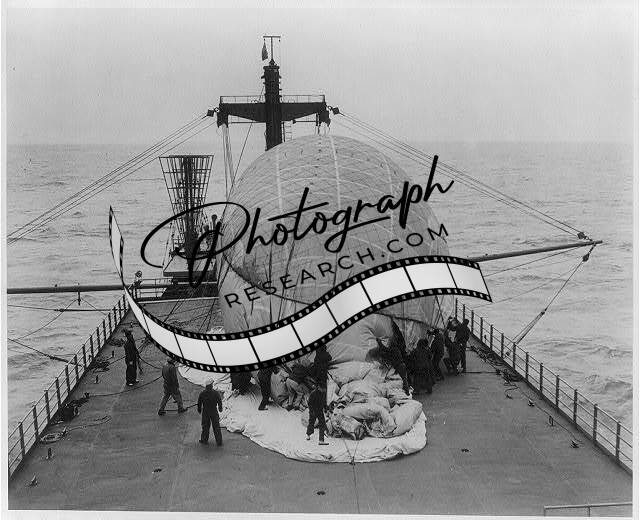 Summary: Launched form USCG cutter COURIER: Balloon spread out on the flight deck as crew prepares to inflate it with helium gas.