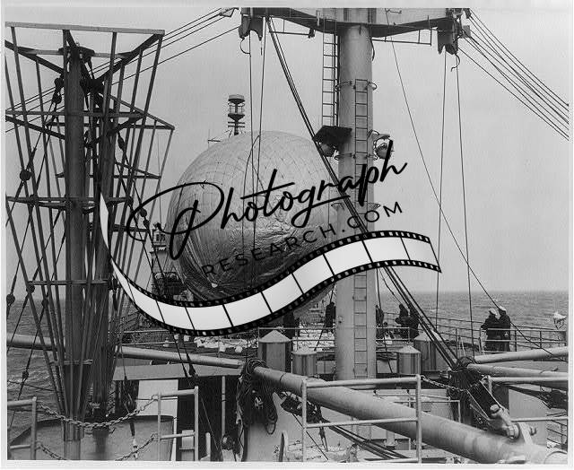 Captive balloon supports 'Voice of America' antenna,USCG cutter COURIER,1952