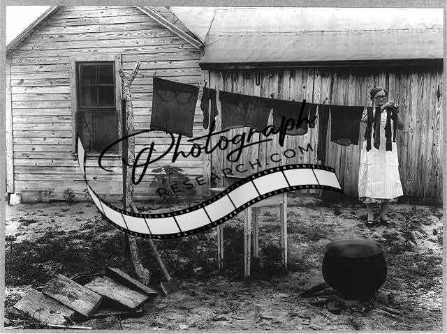 Woman hanging clothes on line,steaming cauldron,1931
