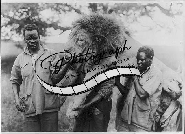 Dead lion being held by porters,January 2,c1931,Africa,Hunting