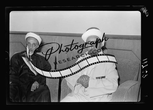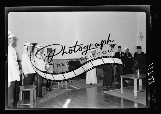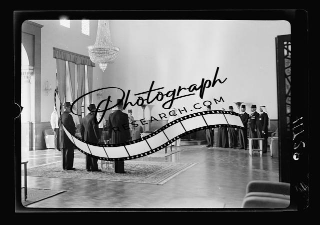 Title: Amman. 24th anniversary of Arab revolt under King Hussein & Lawrence, celebration Sept. 11, 1940. The Emir receiving officer of the Arab Legion. Cabinet ministers on the right of picture. The Levee in reception hall