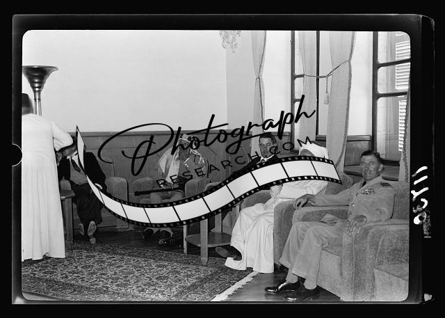 Title: Amman. 24th anniversary of Arab revolt under King Hussein & Lawrence, celebration Sept. 11, 1940. The Emir receiving the Islamic religious officials, officers of the Arab Legion [on] the left