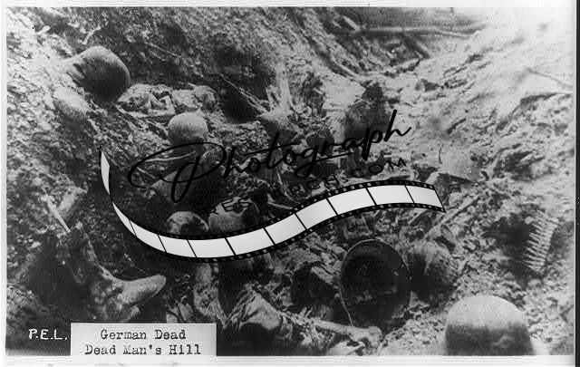 German Dead, Dead Man's Hill., Skulls, bones, helmets, etc., in trench]